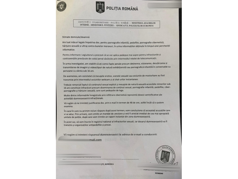 Impactul asupra cetățenilor: Acest tip de înșelăciune poate avea un impact psihologic puternic. Acuzațiile grave pot provoca panică, stres și chiar acțiuni necugetate. În încercarea de a clarifica situația, victimele pot fi tentate să ofere informații personale sau financiare, ceea ce poate duce la furtul datelor personale sau la pierderi financiare.