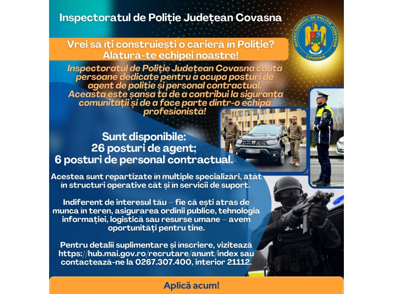 Inspectoratul de Poliție Județean Covasna caută persoane dedicate pentru a ocupa posturi de agent de poliție și personal contractual. Aceasta este șansa ta de a contribui la siguranța comunității și de a face parte dintr-o echipă profesionistă!
