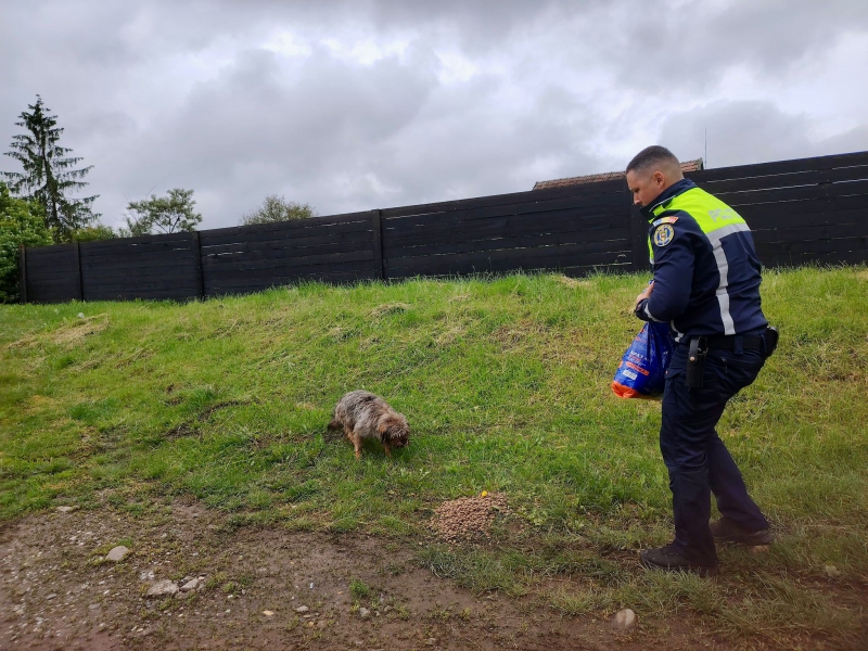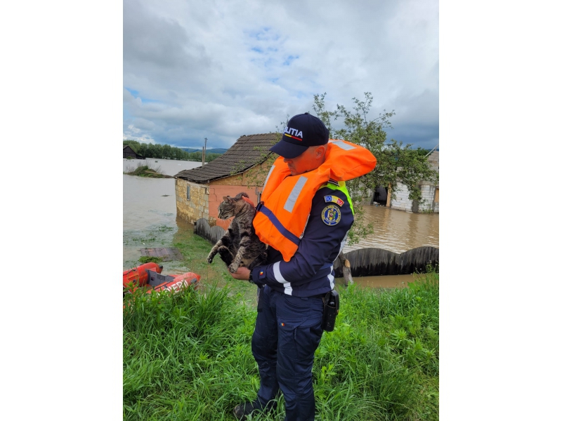 Vineri, polițiștii de la Biroul pentru Protecția Animalelor s-au deplasat în localitățile cele mai afectate de inundații, la gospodăriile din zone greu accesibile, pentru a duce hrană animalelor rămase fără stăpâni ori sprijin, dar și pentru eliberarea celor rămase prinse între ape.